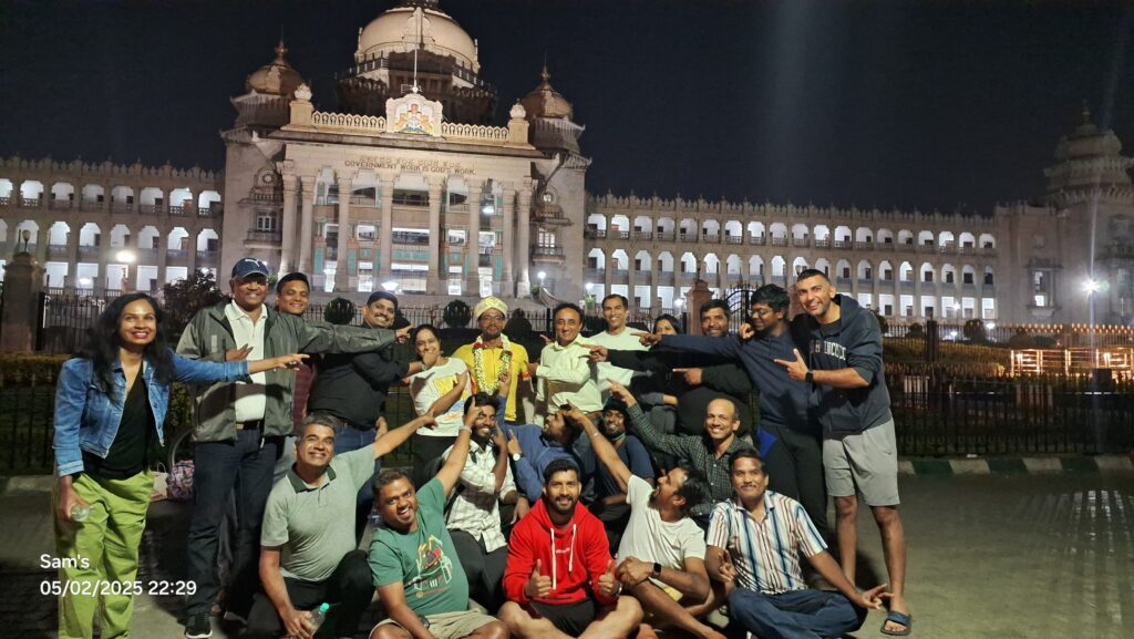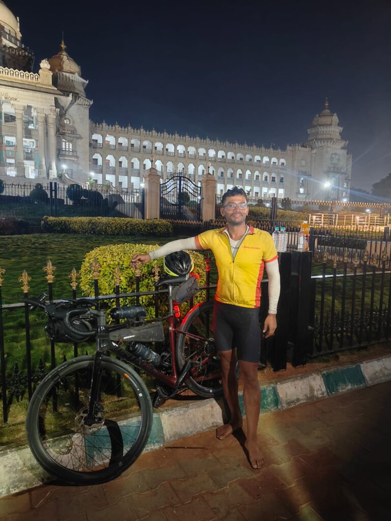 The final Day or the 6th day began with a huge climb of 1300m on a 25kms long hill climb, I kept pedaling at a comfortable pace and the kilometers kept moving ahead, after 17.7kms of climbing there is a small 2kms flat section, as it was now 7am in the morning I got down for a quick tea and a bite. As I was getting back up on the cycle I had a severe knee pain and was not able to pedal at all, so I decided to run for a while, held the shoes and my cycle in one hand and started running up the slope pushing my cycle. After running up the slope for around 20mins I felt good and then I was able to wear my shoe and pedal again. By the time I reached Madikeri @2020kms it was 8am, but now only last 270 kms were remaining and I was determined to finish by 9- 10pm. I kept pedaling and visualizing the finish. My family and friends were all keeping track of my progress and had informed them of my ETA at 10pm in the evening. I wanted to enter Bangalore in the non rush hours so that I could finish in the dark and in peace. The last 270 kms were tough mentally as I was suffering from the saddle sore and the knee pain, taking frequent but small breaks and kept moving towards the finish line. Finally I was able to reach Vidhan Soudha in Bangalore at 10pm in the evening. A good crowd of 30-40 cyclists with family and friends had gathered to welcome me back.