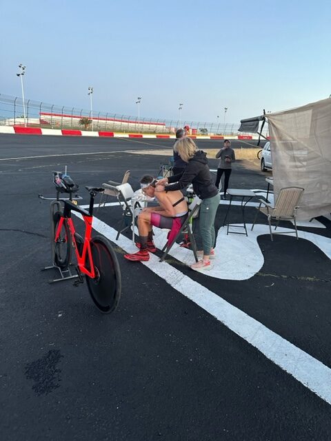 The 100K portion was uneventful, just clicking off laps and trying to not push too hard, as there would still be another 3.5 hours. Took the first handoff about 40 miles in and cruised through the 100K with sites set on the 100-mile. The wind was picking up and this required shifting, twice per lap, to keep the cadence and power consistent. Approaching 90 miles, I realized that I would have to lift the pace a bit to go under 4:00 by the 100 mile. But as I passed 95, it was obvious that if I continued to do so, I would likely pay for that and post a much slower 200K, so I just held pace to roll through at 4:02. With the increasing wind gusts, along with an asphalt track surface better suited for stock cars than bicycles, the energy expenditure to stabilize the bike was elevating my heart rate as my wattage was reducing and speed was being clipped, plus the effect it was having on my right shoulder (outside) had passed the point of discomfort. Michael Hemmerlin, a talented cyclist and recent graduate of the Marion University cycling program, was my new handoff man, inheriting this position from his father Greg, who was incredibly proficient on the roller blades during previous attempts but has moved up to Official status. Moving handoffs were seamless with Michael’s bike handling prowess. Around the 4:16 mark, after I had passed the 60+ 6-Hr record of 106 miles, we had a quick discussion about the change in wind and my physical distress, deciding to push through the 200K and see what happens. About this time, a great friend of ours arrived at the track, el Padre, aka Fr. Del Toro. This was a big boost to the morale – and incredibly good timing, as the next 18 miles were the toughest of the day, working hard to stay close to the 25 mph average with the power dropping off and the heart rate rising. Covered the 24 miles, from the 100-mile to the 200K, in 1:05 and then let up on the pace considerably, realizing after only one mile that I had to stop to attend to my issues. The heat was an immediate threat, that I had not appreciated while moving at pace. Dr. Hefferon, an incredible chiropractor and energy med specialist, was quick and efficient at attending to my physical issues, thank God. Losing 15 minutes was better than quitting, or ending up in the ER from dehydration, but I was back on the bike before the 5:30 mark and clocked about another 12 miles to hit the unofficial mark of 136.9 miles.