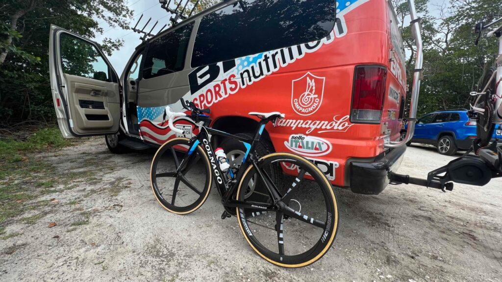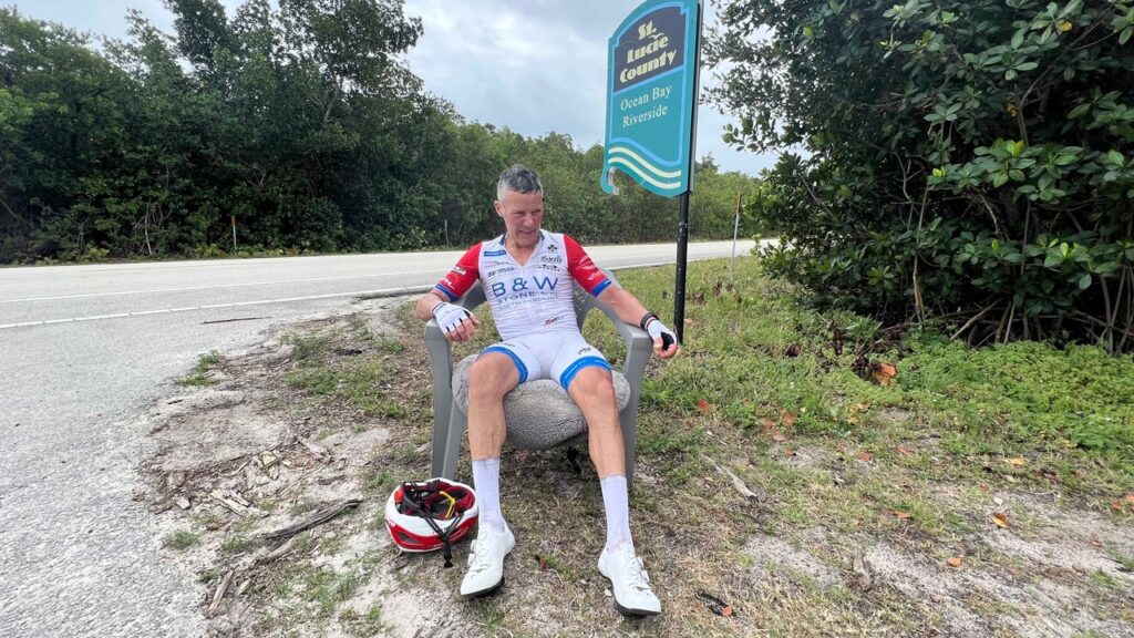 We landed on a 32 mile out and back course on Hutchinson Island, Florida. Flat, good bike path marked on the road with two roundabouts or rotaries at each end to maintain a smooth turn around. I have always raced well in the heat and heat brings with it low air density, all conducive to speed.