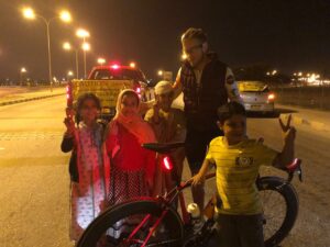 It provided an incredible boost in motivation to encounter spectators who were tracking my journey, come to the side of the road, even out in the wilds in such remote locations, to photograph and cheer me on. With stomach cramps which had plagued me all night abating, I was able to adopt a more aerodynamic position on my bike and try and make some headway into the day’s journey, before the inevitable midday desert heat slowed my progress. Temperatures rising faster and higher than the previous day, unbeknown to me at the time, I was consuming almost more water than my support crew were able to source from the infrequent shops along the route. The temperate after midday rose above 37oC, for a day that was to be entirely staged in vast desert. I knew I couldn’t afford to lose the precious hours of pedaling in this mid part of the day; to avoid a repeat of the previous day’s complications I chose a strategy of 30 mins riding, followed by short stops to be cooled by my team. This wasn’t easy but did allow me to push on without developing further sickness. With 400km to go and the road now narrower and void of a hard shoulder for the most part we were pulled over by the police and instructed to place one of our follow cars in front of me. We did this but made sure it was far enough infront to negate any drafting effect and not contravene the rules. At roughly 20:30 I crashed heavily at 40km/h after hitting some large potholes. Bruised and bloodied, I quickly picked myself up, switched bicycles and continued. Any further rest had to be kept to a minimum, breaking the two-day mark was going to be touch and go. 80 km from Salalah and my finishing point, I reached my final road into the city and was met by an incredibly enthusiastic Medina Ilyassova, who had not only believed in me and backed my idea with her company UB-COOL months ago but had now flown down to Salalah and driven out to meet me. At 700m above sea level there were a few very steep kilometers of climbing across the Dhofar mountains to reach the final 900m summit, before ascending to the coast. Cresting the summit at 4:30 in the morning I was overwhelmed to be confronted by tens of Omanis who had heard about what was happening and who had come out to cheer me on. A 90km/h descent, riveted to my top tube and I was in Salalah, confronted by crowds of people, young and old who had all come out at such an ungodly hour, to welcome me with huge illation, after unbeknown to me, oblivious over the past two days, news of what I was doing had been spreading both across the country and internationally.