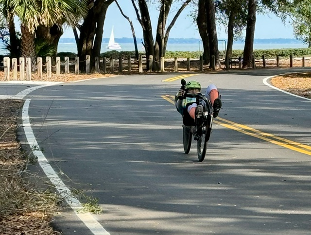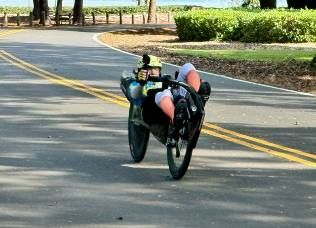 OK – back to the attempt. During the 1st hour in the dark I managed to average about 23 mph which was very good for night riding – but I was also very rested. About 8am a security car stopped dead in the road with its flashers on. I thought for sure they were going to flag me down, make me stop and ask me what I was doing or make me stop for some reason. I called someone at the HOA I knew and asked them to call the chief of security and tell them what was happening. I did ask for permission to do the attempt and to park overnight in the parking lot and was assured I would not be bothered (or asked to stop) during the attempt. They never flagged me down or asked me to stop but they were stopped dead in the road for at least 15 minutes. This was rather dangerous as it was my lane they were in and I had to pass them into the oncoming lanes 4 different times. Later I found out the security officer had to chase down, capture, and move an alligator from the area! Yeah – this is kind of a common occurrence in my subdivision! Then at about 9am (3 hours into the attempt) a huge street sweeper showed up. Another traffic hassle and safety issue which I thought riding on this small loop in a private subdivision would be free of! The big sweeper would stop with no warning, do U-turns in the road, and drive straight down the center scrubbing and vacuuming up everything. It was pretty stressful having this around for the next 2 hours as it drove in and out of each side street and up and down the road at least 3 times. But I will have to admit, it was really nice to have all the stuff off the road, especially when it got dark! Even with that, by the time my attempt was over, the windy conditions and just general autumn leaves falling had dropped a lot more. Even through all this action, I continued riding this course for 6 hours non-stop, taking a drink from my fuel bottle every 15 minutes. I did not eat anything. At the end of 6 hours I had ridden 140 miles with an average cadence of 96 and average speed of 23.3 mph! I was very happy with that result, and of course dream of doing it 3 more times! Yes, only a dream!