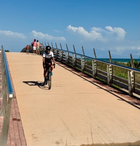 My 75th birthday occurred on a Saturday, the eve of the finish. I began the day on a beach boardwalk. A kind young lady warned me that bikes could not be ridden on it on the weekend and that she’d seen police ticketing cyclists. Walking my bike was painful because of the corn, so I coasted without really riding when I could and walked when there were pedestrians around.