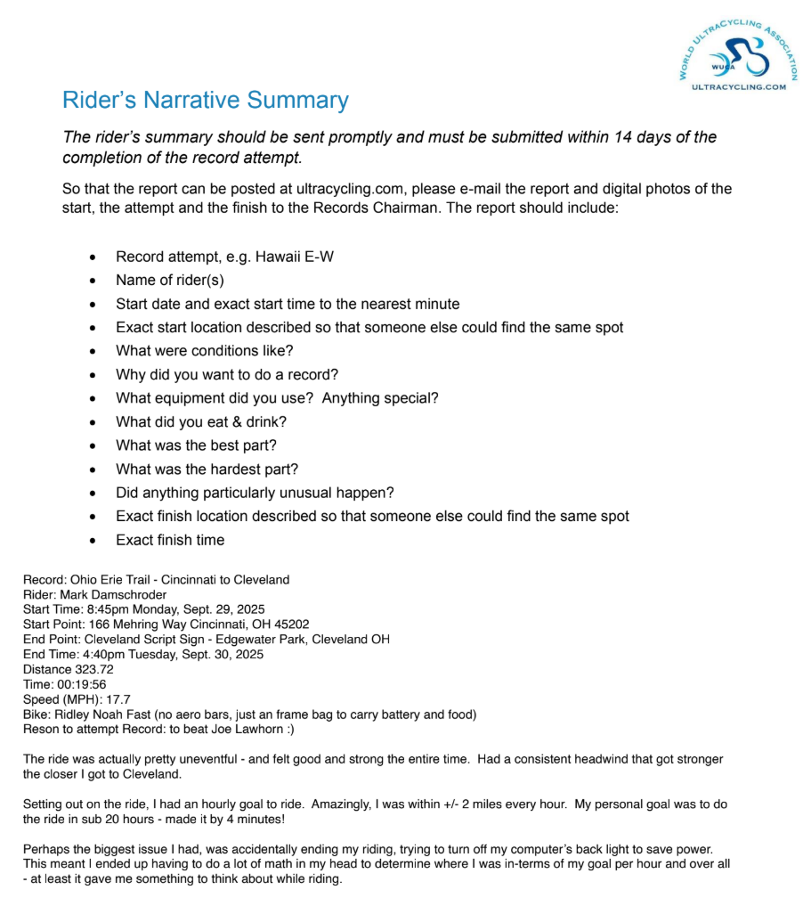 Mark Damschroder – Ohio Erie Trail S-N attempt – Sept 29-30, 2025 Congratulations to Mark Damschroder who broke the current Ohio Erie Trail S-N by over 2 hours. Larry Oslund2025-10-06T08:49:09-07:00