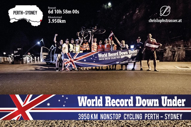A first for the WUCA, a new record across Australia. Christoph is training for another RAAM attempt and on this trans-Australia ride he maintained an average speed very close to his best RAAM record speed of 16.54 mph.